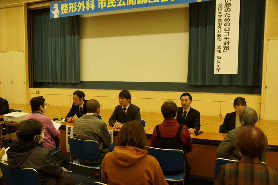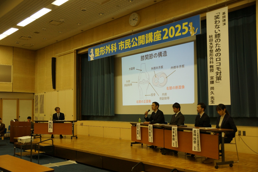 またその後のパネルディスカッションでは山王整形外科の湊先生のコーディネートのもと、秋田赤十字病院の冨手先生、大曲厚生医療センターの高橋先生、能代厚生医療センターの塚本先生、市立角館総合病院の若林先生が対話形式で解説を行い、膝に関連した様々な疑問への理解を深めていきました。
