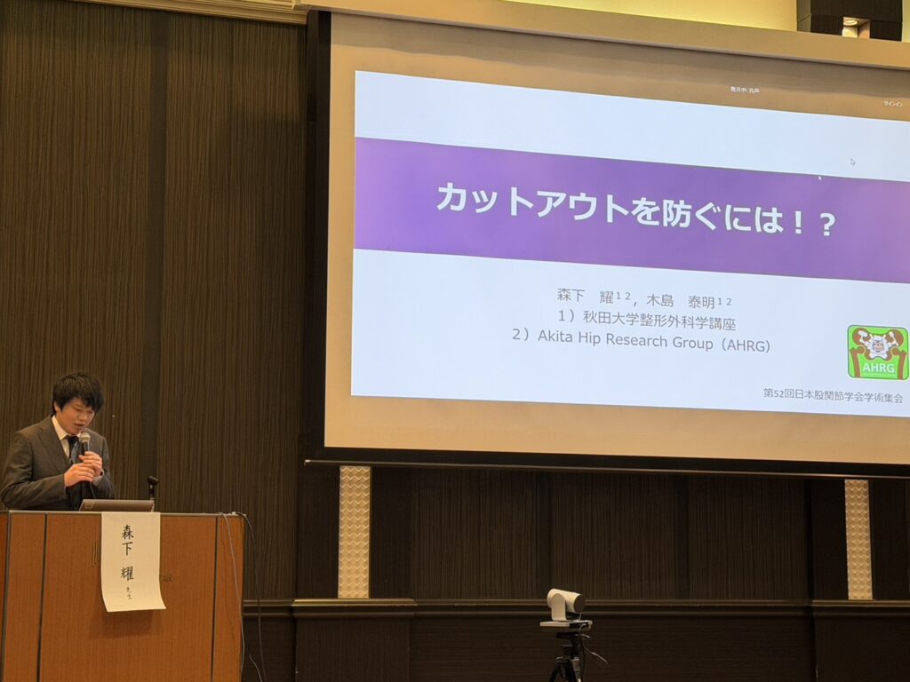 私からは「ステム周囲骨折を防ぐには!?」というテーマでお話しさせていただきました。Akita Hip Research Groupの貴重なデータからセメントレスステムにおけるステム周囲骨密度変化についてステム機種ごとの違いの研究報告、そしてステム周囲骨折の頻度の解析を行い、術後早期ステム周囲骨折のリスクについての報告と最新の論文からより良いステム選択について紹介させていただきました。ステムデザインを考慮したステム選択をすること、最適な骨粗鬆症治療介入が重要と考えます。