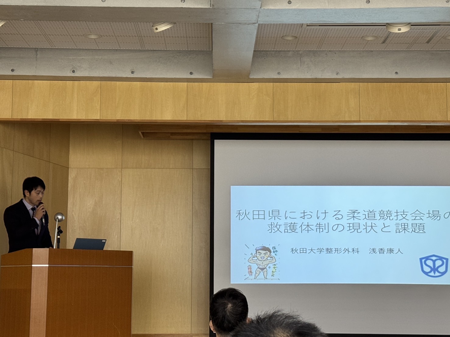 研究会ではシンポジウム「地方での柔道大会運営の現状」において、私から秋田県における柔道競技に対する救護活動の現状について発表をさせていただき、各県の取り組みや今後の課題などを共有する貴重な機会となりました。 全体を通して、柔道に関する様々な問題点や疑問点をテーマにしたユニークな演題が多くあり、大変勉強になりました。