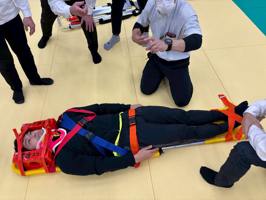 救護講習会では、実際の試合において外傷等が発生した場合の対応について詳細に講義をしていただき、止血等の基本的な処置から脳震盪や頸椎損傷に対する適切な固定・搬送方法まで幅広く知識を深めることができました。